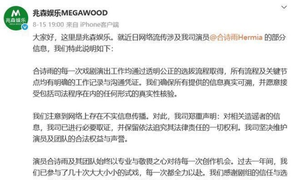 面对满屏质疑,新晋顶替者合诗雨和她背后的兆森娱乐公司倒是很快做出了回应。他们一本正经地表示:所有选拔流程都是公开透明、证据齐全,经得起司法检验。“我们绝对清白!”这架势,比银行流水查账都认真。不过该公司的第二份声明画风突变,说什么因工作安排调整,与相关方沟通一致后决定退出,不再参与客串工作。这前后反差,就像食堂阿姨昨天刚夸你长高了,今天却只给半勺米饭一样,让人摸不着头脑。