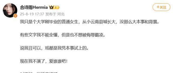而真正让吃瓜群众觉得刺激的是,当事人合诗雨本人直接上线,把自己的委屈和无奈摊到台面上:“我只是个普通大学毕业生,从云南的小县城走出来,没有啥后台,本事有限但试镜过关。”她甚至自嘲,“说我丑可以,但戏都是凭实力争来的,现在不演了,爱谁谁吧!”一句话,把整个事件推向高潮,也算是把互联网嘴仗玩明白的人才。