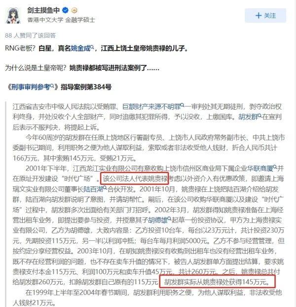 此前有网友科普RNG老板资料,曝光RNG老板白星的老爹曾因贿赂被写进刑法案例。