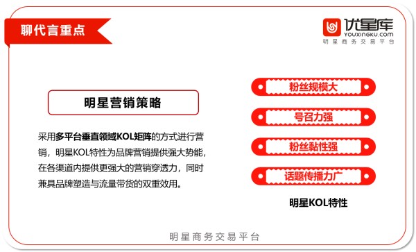 而明星既有头部KOL:具备的较高粉丝规模和号召力的基础特性,也具有极强的粉丝黏性和话题传播力特性,为品牌营销提供强大势能,在各渠道内提供更强大的营销穿透力,同时兼具品牌塑造与流量带货的双重效用。