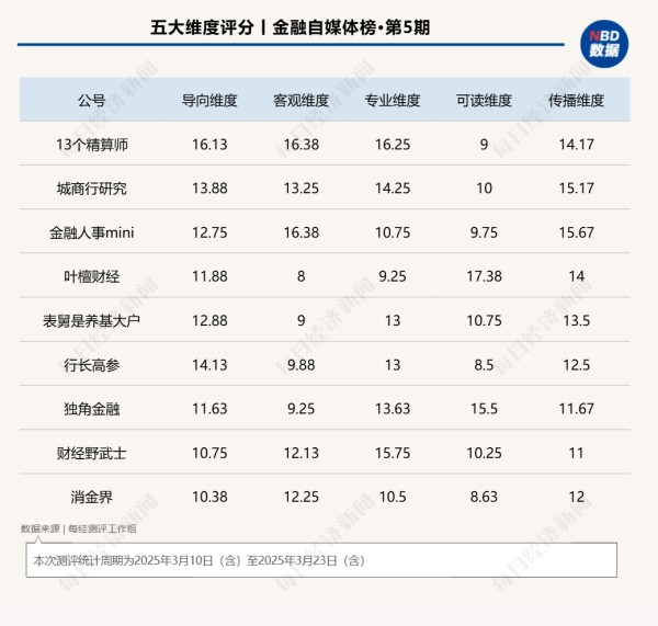 自2025年起,《每日经济新闻》金融自媒体测评工作组隆重推出金融自媒体榜。首个测评系列聚焦于微信公众号,测评小组从导向性、客观性、专业性、可读性和传播性五大维度进行测评,并公布综合得分前十的金融自媒体公众号。
