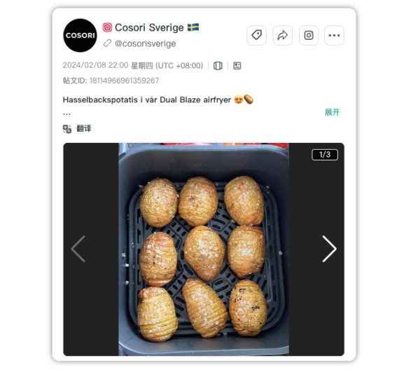 而作为瑞典国民小菜的Hasselback土豆(风琴土豆)也被搬上Cosori的瑞典主页,受到瑞典消费者的热烈欢迎。