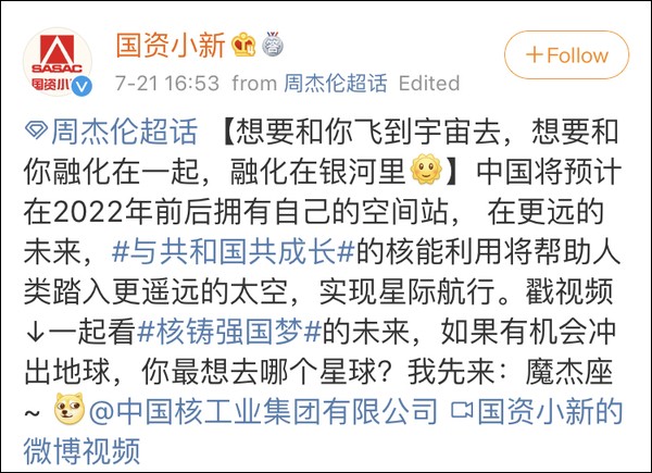 甚至连国务院国资委新闻中心@国资小新 和@中国核工业集团有限公司 都闻声前来,纷纷在微博发文中带上了周杰伦的超级话题。