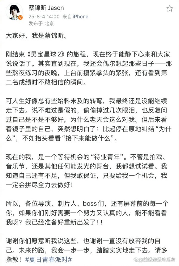 这位男艺人在长文中详细阐述了自己目前的职业困境。他表示,自己虽然怀揣着对演艺事业的无限热爱和追求,也付出了诸多努力,但却一直没有得到合适的工作机会。