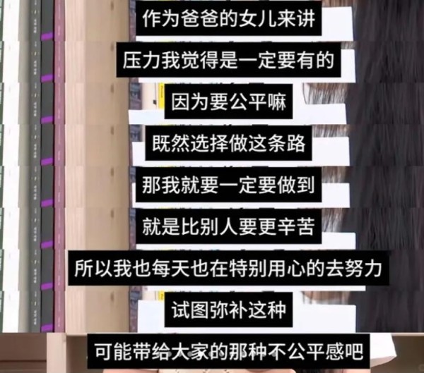 因为作为明星的女儿,一定要让自己感觉到压力。既然选择了走这条路,就一定要比别人更努力更辛苦,这样才能弥补可能带给大家的那种不公平感。