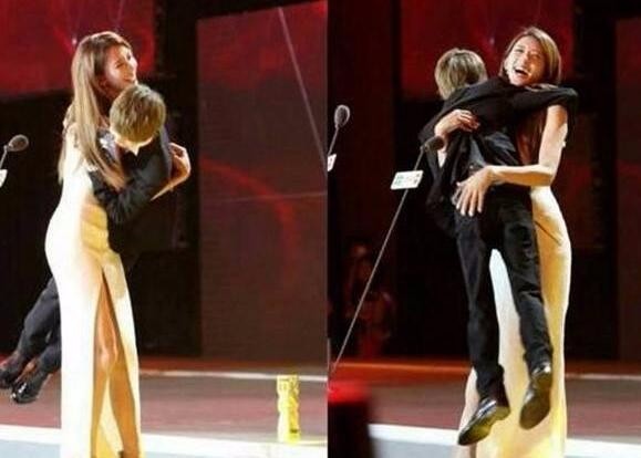 3 / 6 3.是在北京的一个颁奖盛典上,林志玲为感谢郭敬明给自己颁发奖杯,礼貌的与他半蹲拥抱合影。身高170加上高跟鞋的志林姐,为了缓和身高差的尴尬,便抱起了只有150的小四,还抱着他连转三圈!不认识的人肯定会以为是妈妈抱着上初中的儿子呢!
