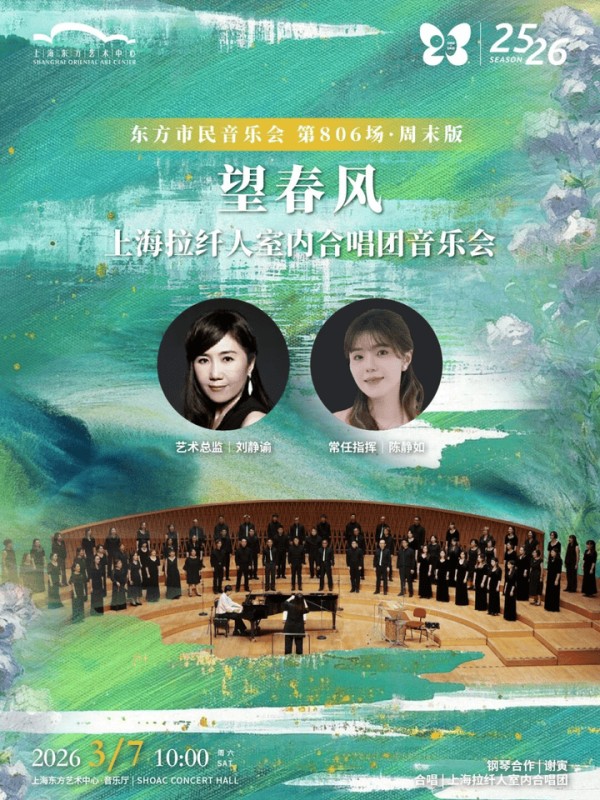 3月两场演出各具韵味:上海拉纤人室内合唱团献演“望春风”专场,带来《如愿》《身骑白马》等改编精品。