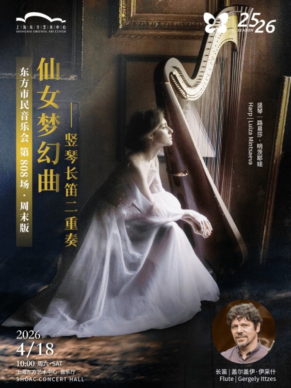 4月18日,俄罗斯竖琴名家路易莎·明茨耶娃与匈牙利长笛演奏家盖尔盖伊·伊采什联袂带来“仙女梦幻曲”二重奏,奏响德彪西《月光》、皮亚佐拉《探戈的历史》等曲目,仙气满盈。