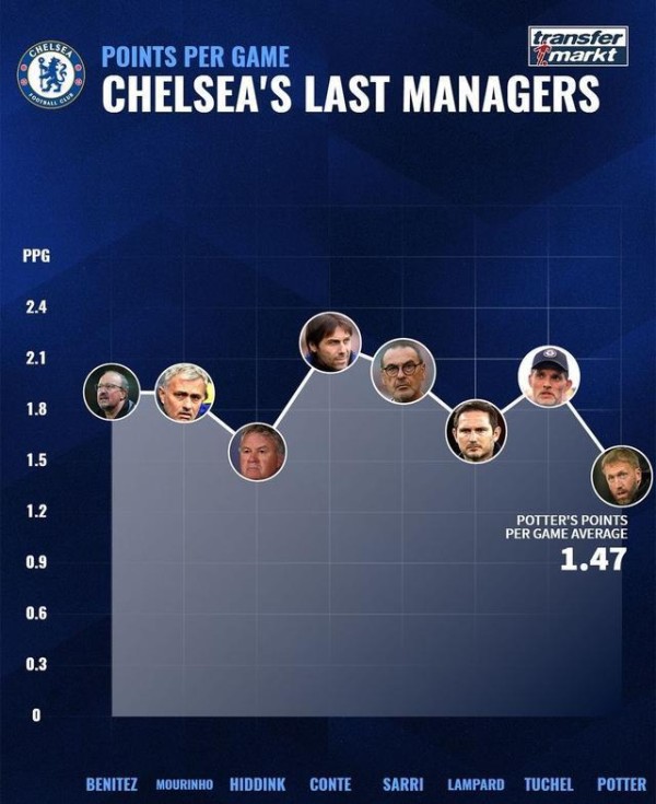 直播吧3月21日讯 德转盘点了切尔西近8位主帅带队场均积分,其中现任主帅波特场均仅拿到1.47分为最低。