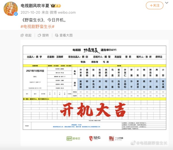 还有一个美丽的巧合:三年前的今天(10月20日),正是电视剧《风吹半夏》(曾用名《野蛮生长》)官宣开机的日子。