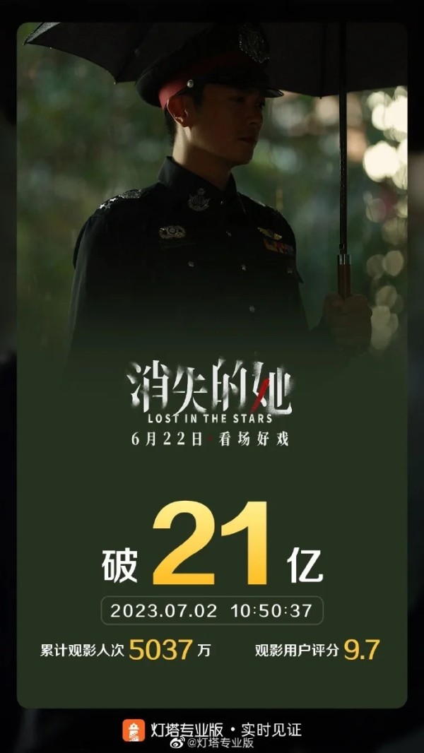 同时,截至7月2日10时50分,影片《消失的她》票房突破21亿,观影人次超5000万。
