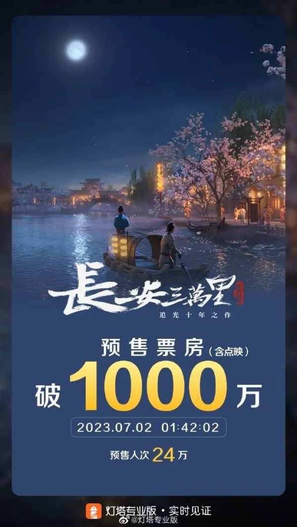 同时,影片《长安三万里》点映及预售票房破1000万,本片2日开启点映,7月8日正式上映。