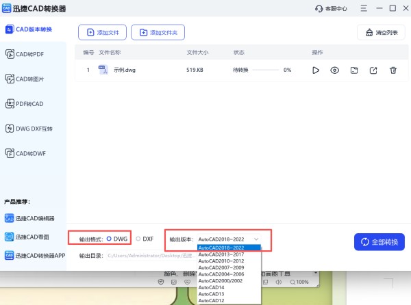 打开工具后,在首页选择【CAD版本转换】功能,上传需要查看的 DWG 文件,选择合适的输出版本和格式,设置保存路径后启动转换,完成后就能直接查看文件。