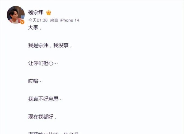 还算幸运,24日凌晨大概六点左右,杨宗纬 himself 通过微博发声报平安:“我没事,让你们担心……我真的受到了大家很多的关心,我们都要保重啊。”这简简单单的话语,却满满的温暖,粉丝们终于松了一口气。