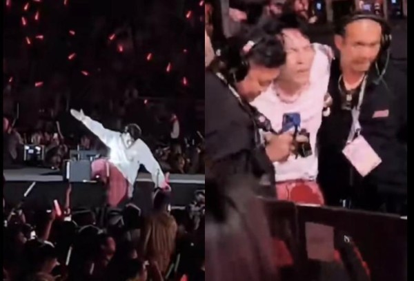 然而在演唱过程中,他在后退时似乎没有注意到舞台边缘的距离,整个人突然消失在舞台灯光之下——从约 两米高的舞台边缘 直接坠落地面。