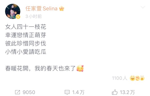 相较于其他几位男生对恋情曝光的沉默,Selina与神秘男子挽手同回酒店的画面,以及在街头展现的轻松愉悦,都透露出她对这段感情的积极态度。随后,Selina在社交媒体上大方承认了恋情,并写道:“女人四十一枝花,幸运恋情正萌芽。彼此珍惜同步伐,小情小爱请吃瓜。春暖花开,我的春天也来了。”