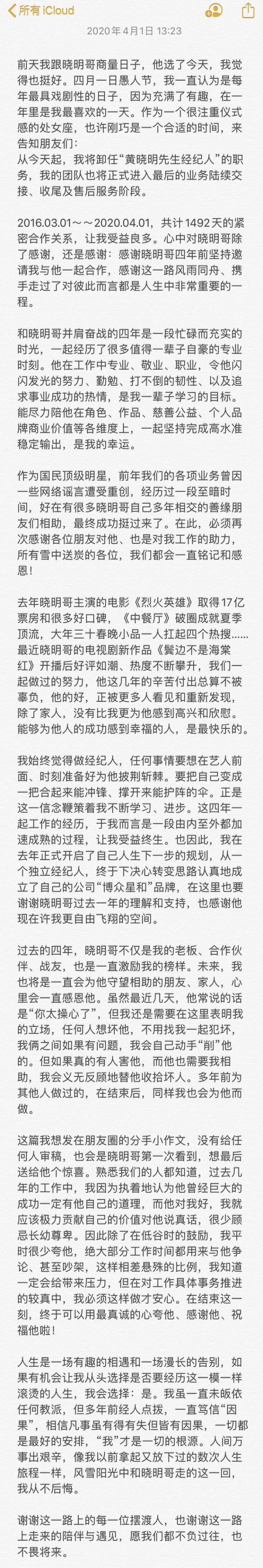 4月1日黄晓明在朋友圈发文宣布与经纪人郭婷婷结束合作,并感谢了她这些年的付出,稍后其经纪人也在朋友圈发长文承认了此事,并表示与黄晓明一起走过一程永不后悔,对其大加赞赏。