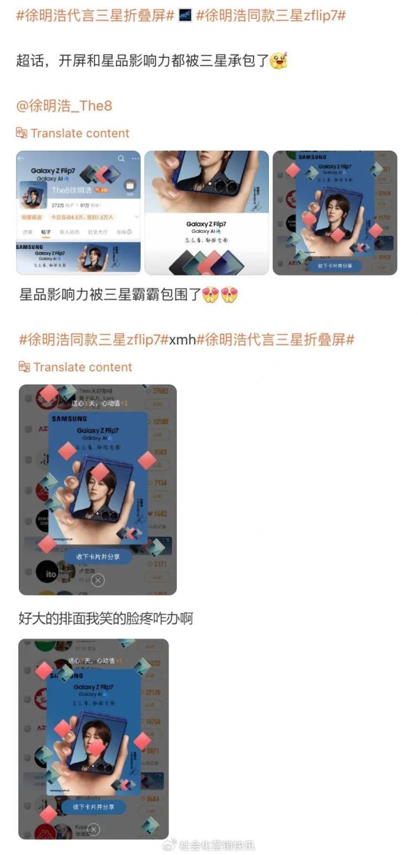 在激发起粉丝的兴趣与热情之下,#徐明浩代言三星折叠屏#话题在官宣首日下午5点,便冲至5583万阅读量,互动量达151万,讨论量达60.7万。