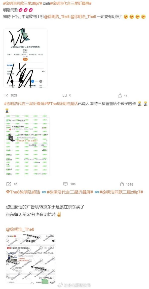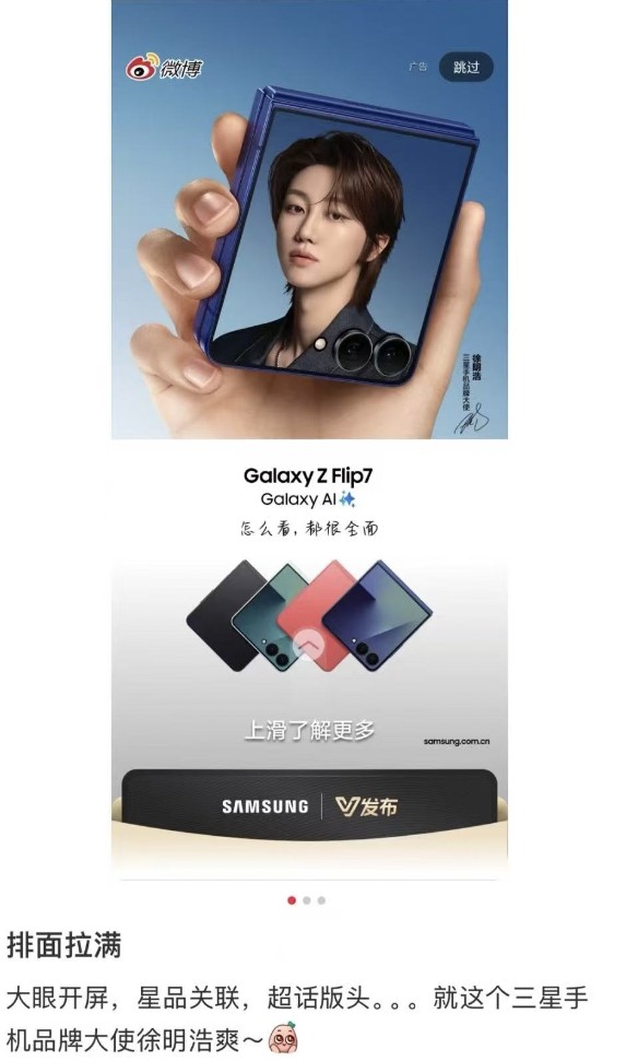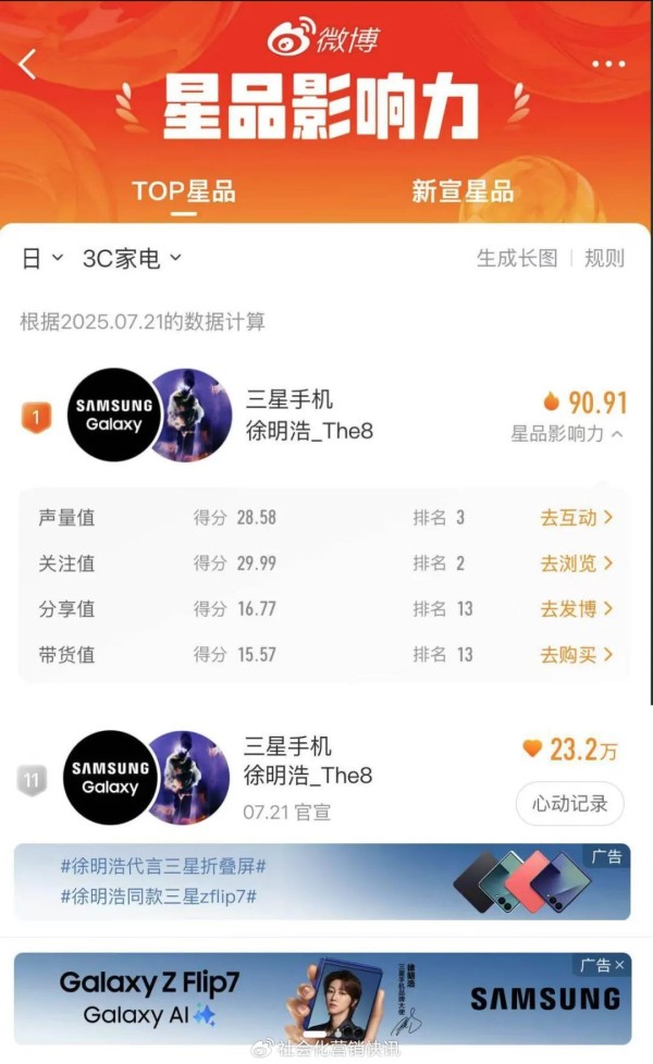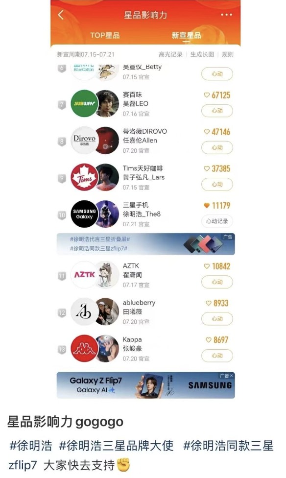如近期三星与徐明浩的代言合作,就充分发挥了星品榜单的这种特性,让品牌与粉丝的互动跳出了传统框架,玩出了不一样的新意。