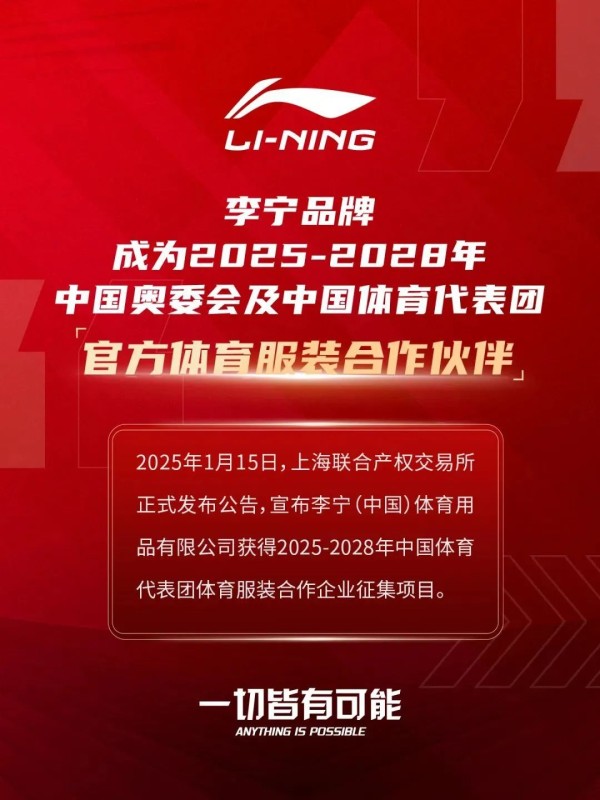 北京时间1月15日,上海联合产权交易所正式发布公告,宣布李宁获得2025-2028年中国体育代表团体育服装合作企业征集项目。李宁官方社媒跟进发布喜讯,并配上了经典的口号——“相信,一切皆有可能!”