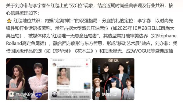 亲爱的小伙伴们,今天我们要聊聊娱乐圈的红毯盛宴!就在最近,刘亦菲和李宇春两位女神级人物,共同亮相某大型活动的红毯环节,瞬间吸引了无数镜头。她们不仅气场强大,更是将时尚与个性展现得淋漓尽致,快来跟我一起种草吧!