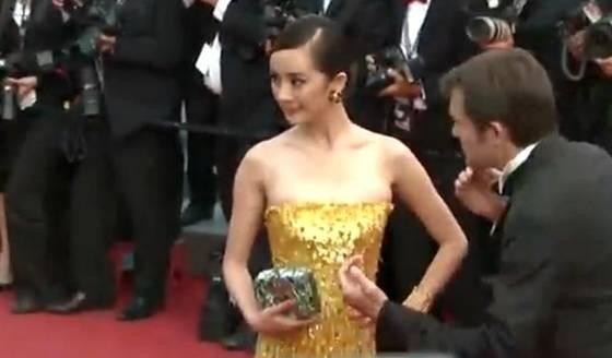 李冰冰曾在红毯上走了2分45秒,慢慢地走,慢慢地摆造型,拍照,不过也是被保安催了好多次,有些尴尬了。