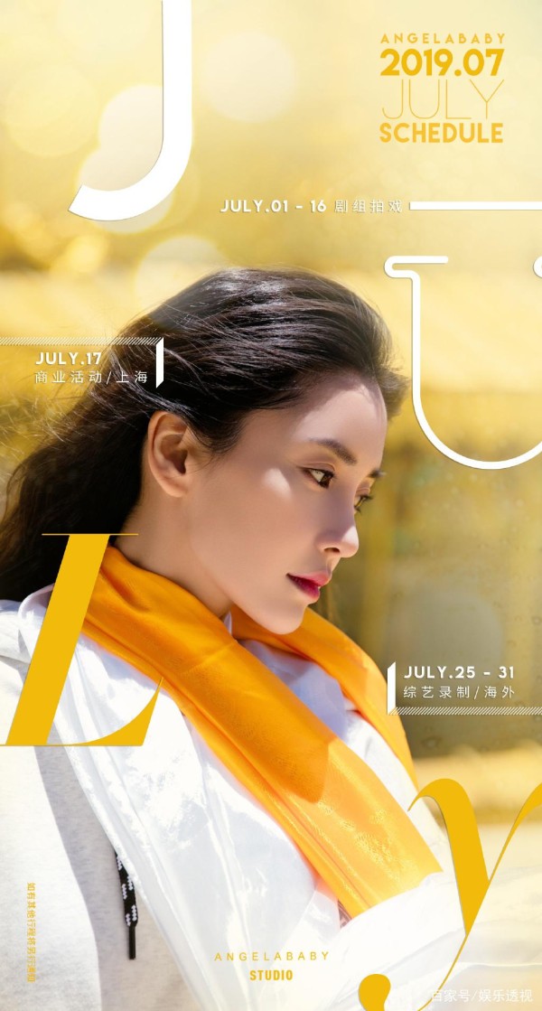 相比于杨幂的七月工作行程,Angelababy的七月行程则是比较丰富,从中可见,在7月1日到7月16日,baby一直是在剧组拍戏,根据之前网络媒体报道,baby的该部戏名称为《摩天大楼》,据悉baby将实验女二号;在7月17日,baby将在上海参加某商业活动;在7月25日到7月31日,baby则在海外参加综艺节目录制,不言而喻是《奔跑吧》,按照往年惯例跑男末期一般都会在国外进行录制一期。