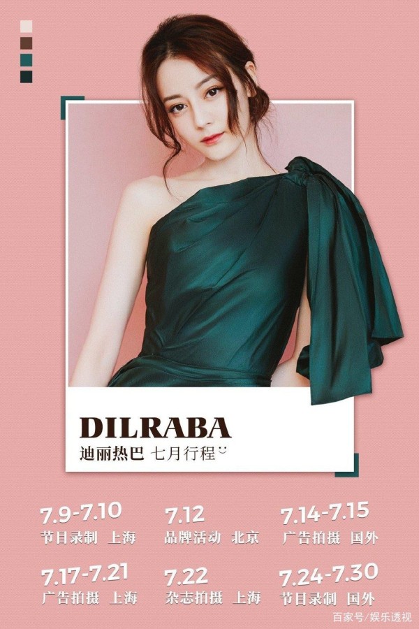 在七月份,迪丽热巴的工作依然是以综艺节目和商业活动为主,从其七月行程图可见,在7月9日到10日,迪丽热巴在上海进行节目录制,不难猜测正是《极限挑战》;在7月12日,迪丽热巴在北京参加品牌活动;在7月14日到15日,迪丽热巴则是在国外进行广告拍摄;7月17日到21日,热巴将在上海进行广告拍摄;在7月22日,热巴在上海进行杂志拍摄;在7月24日到7月30日,迪丽热巴则是在国外进行节目录制,目前热巴综艺仅剩《极限挑战》,而该档期活动与baby月底行程相似,令人猜测迪丽热巴是否会回归跑男呢。