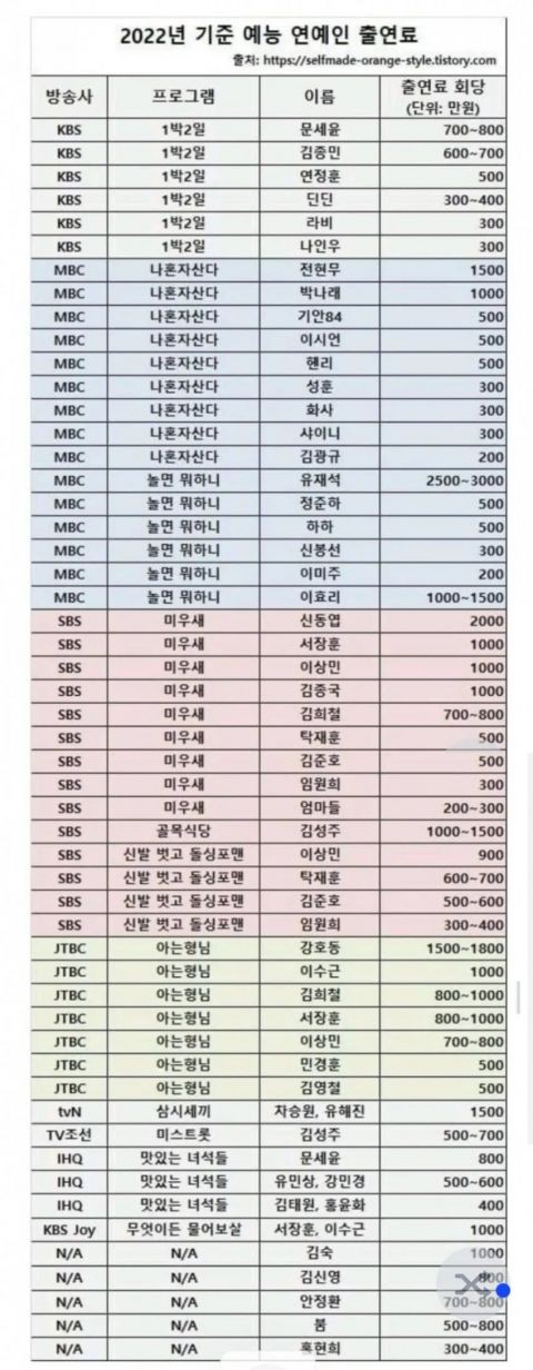 这两日韩网上惊现了一张2022年艺人收入的截图,以《两天一夜》、《我独自生活》、《玩什么好呢》(玩甚么好呢)、《我家的熊孩子》、《认识的哥哥》、《脱掉鞋子恢单4MEN》、《一日三餐》、《小巷餐厅》等人气综艺节目的出演嘉宾为主,众人一集的节目收入少则200万(韩币,下同),多则3000万。 嘉宾们的收入差异较大,主要取决於他们的知名度、节目平台等原因。