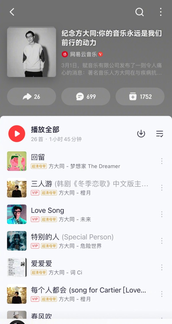 #方大同[超话]# 【#26首经典歌单送别音乐才子方大同# 】3月1日,经纪公司发布消息称方大同去世。2月13日,方大同还发了一首新歌《那沙漠里的水》,最后一条微博是宣传新歌。上一次被网友偶遇是去年10月,他现身84岁美国音乐巨匠Herbie Hancock的音乐会。