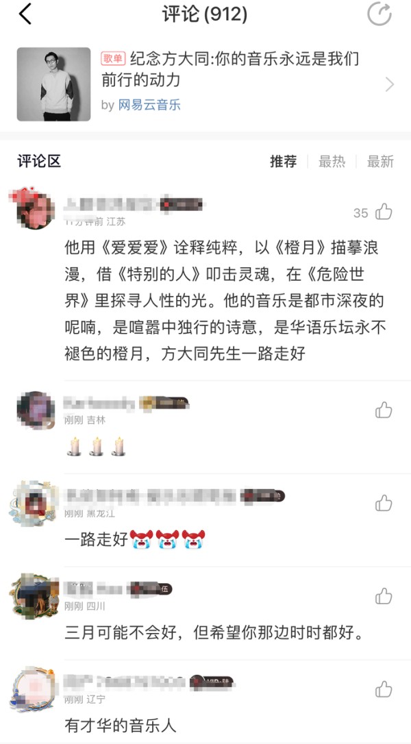 记者看到,网易云音乐推出“纪念方大同”歌单,“再见了大同,你的音乐永远是我们前行的动力”,包括《回留》《三人游》等26首代表作。有网友留言,“他用《爱爱爱》诠释纯粹,以《橙月》描摹浪漫,借《特别的人》叩击灵魂,在《危险世界》里探寻人性的光。他的音乐是都市深夜的呢喃,是喧嚣中独行的诗意,是华语乐坛永不褪色的橙月,方大同先生一路走好”。#方大同曾因操劳过度气胸数度住院##方大同去世# (记者 孔小平)