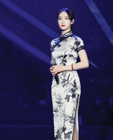 戚薇这一身旗袍同样是走水墨古典风格,只不过在样式上有所不同。大家都知道,梅兰竹菊是我国古代评定的花中四君子,戚薇这身旗袍以此为图案,也是想衬托出一种高贵冷艳的气质。
