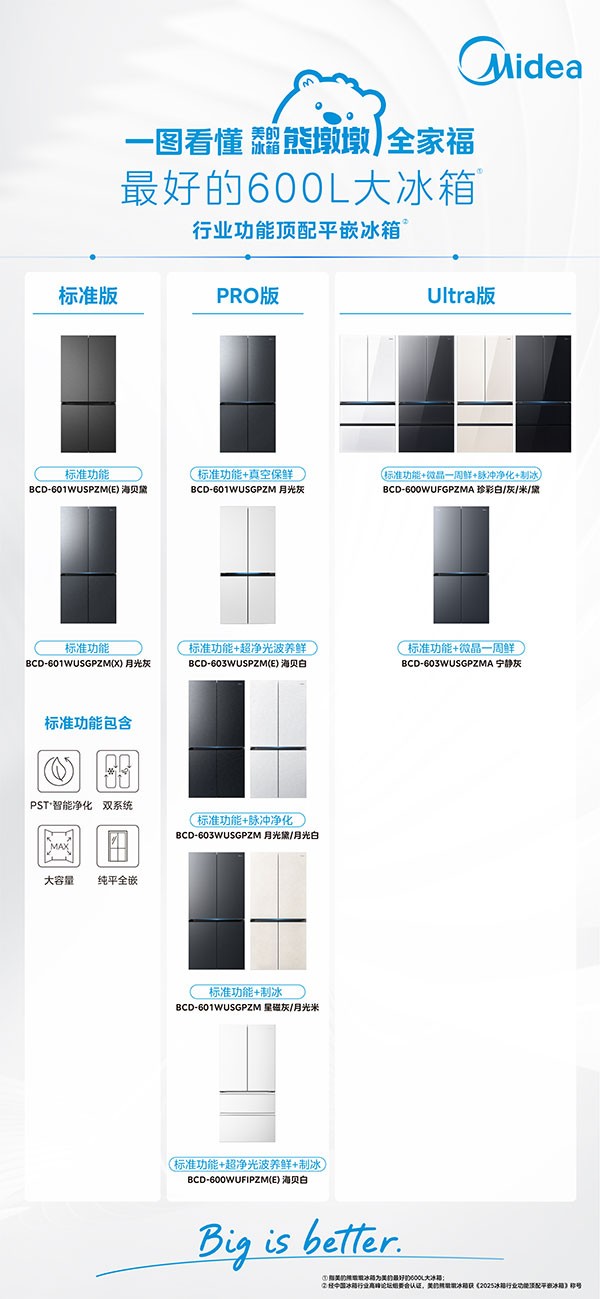 作为美的首个支持功能选配的大容量冰箱家族,美的熊墩墩不仅融入 “顶配” 概念,更细分出标准版、Pro版、Ultra版,价格覆盖几千元至上万元 —— 既全面覆盖大容积、平嵌设计、双系统、净化功能等核心需求,更以阶梯式功能选配,让不同用户都能精准匹配个性化需求。