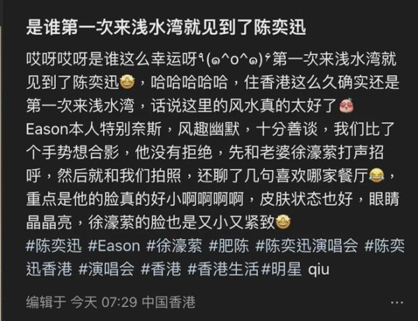 昨日,有女粉丝在社交平台分享与偶像陈奕迅的合照,相中,陈奕迅戴著眼镜,以素颜示人,身穿一身黑色休闲服,精神看上去非常不俗,与女粉丝合照时还绅士地将双手放在身后。女粉丝也大赞陈奕迅非常友善,兴奋写道:“哎呀哎呀是谁这么幸运呀?第一次来浅水湾就见到了陈奕迅,哈哈哈哈哈,住香港这么久确实还是第一次来浅水湾,话说这里的风水真的太好了。 Eason本人特别奈斯(Nice),风趣幽默,十分善谈。”