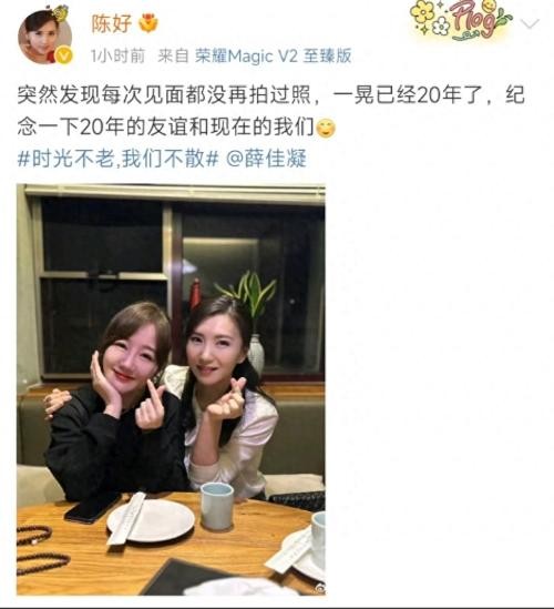 总而言之,久违看到陈好和薛佳凝的同框,不禁让人想到《粉红女郎》,引起了很多人的回忆杀。20年过去了,陈好和薛佳凝都有了各自的人生轨迹,但是她们之间的感情依然坚固如初,姐妹间的感情很好。今天,陈好在社交媒体上晒出了一张与好友薛佳凝的合影,一时间,网络上掀起了一股怀旧的浪潮。照片中,两位女演员携手共进晚餐,仿佛时光倒流,回到了20年前的青涩岁月。这次的相聚让人们不禁感慨,姐妹情深,岁月不居,而友情却依旧鲜活如新。