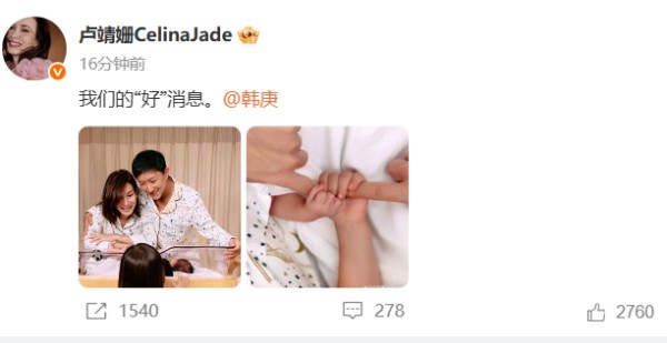 10月24日,韩庚、卢靖姗夫妇在个人账号上晒一家四口合照、牵手照,并配文:“我们的‘好’消息。”
