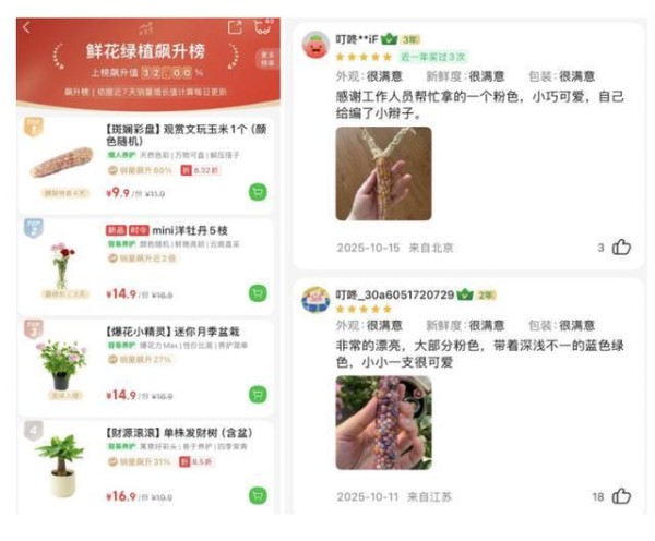 据叮咚买菜鲜花商品开发总监俞水介绍,这类能提供情绪价值的商品已成为平台快速增长的品类,今年销售额同比增长约400%。从去年走红的“人类猫薄荷”山胡椒根,到今年的青皮葫芦、文玩玉米,叮咚买菜仿佛在线上开辟了一个新潮的“花鸟鱼市场”,精准捕捉了年轻人对新奇、自然与精神治愈的需求。