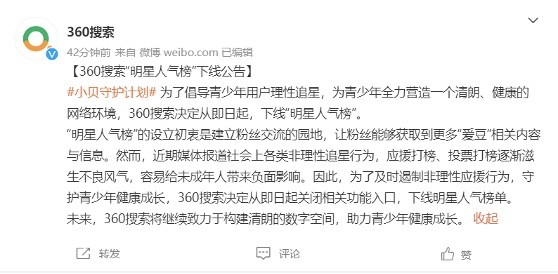 8 月 12 日,360 搜索官方微博发布消息称下线 360 搜索明星人气榜单,倡导理性追星,全力营造清朗、健康的网络环境。