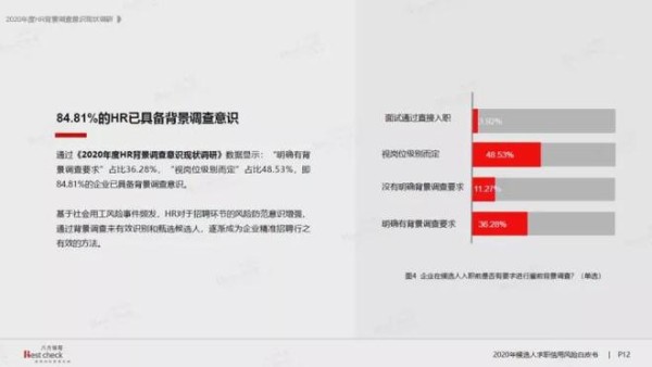 即使如此,国内企业对于背景调查的意识却在不断提高之中。根据《2020年度HR背景调查意识现状调研》数据显示,约84%的企业“具备背景调查意识”。