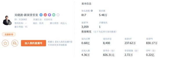 首先,从销售成绩来看,吴晓波等人的观看人数与GMV数据,相比头部主播仍有较大距离。