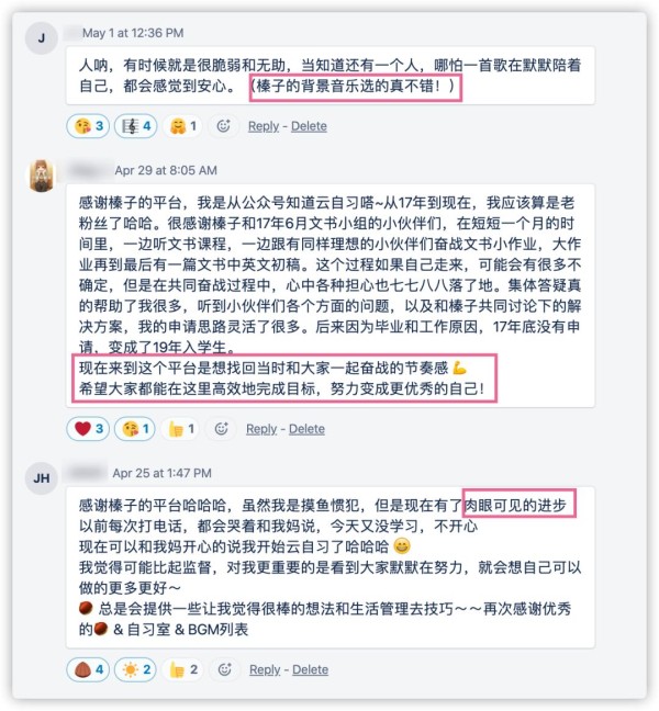 “学习主播的存在也很重要。”榛子说,“去年八月有一整个月我没有去自习室,没更新封面故事,更没有共享屏幕(放音乐)。那段时间的打卡人数非常惨淡。因为这些看似琐碎的小事,背景音乐也好,封面故事也好,emoji表情的回应也好...都是自习室的精神支柱。”