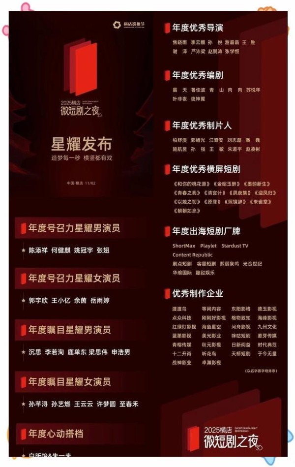 在星光熠熠的横店微短剧之夜上,众多明星如王小亿、郭宇欣、余茵等女星,以及何健麒、陈添祥、姚冠宇等男星,齐聚一堂。他们凭借超高的人气与专业的表演,不仅为这场活动锦上添花,更使微短剧的影响力得到了空前的提升。