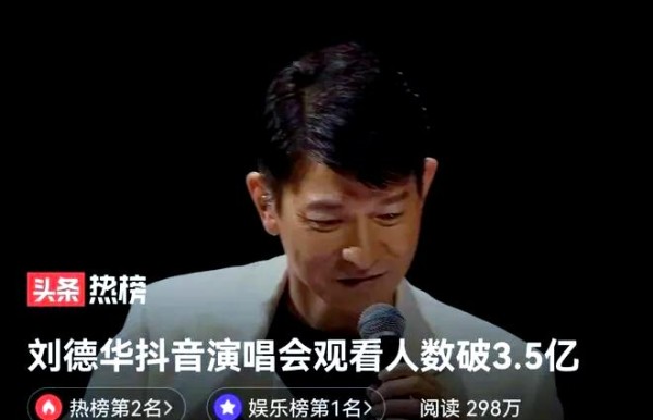 2022年,刘德华在抖音平台举办了一场线上演唱会,吸引了众多粉丝的关注。在演唱《笨小孩》时,短短5分钟内就吸引了高达5000万人的在线观看。随着演唱会的进行,一小时后,在线观看人次迅猛增长,突破了2亿大关。到了演唱会即将结束之际,最终的在线观看人次更是达到了惊人的3.5亿。值得一提的是,中国网民的总数也不过10.32亿而已。由此可见,刘德华的魅力无人能挡,无论是哪个年龄段的人群,都被他的歌声和风采深深吸引。