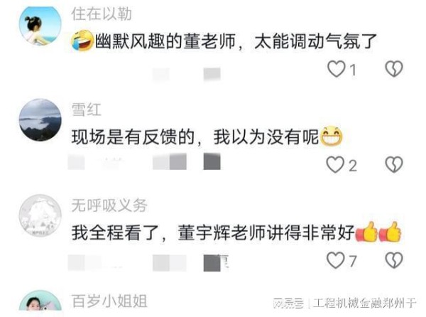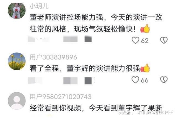 很多网友表示董的控场能力很强,如果一般人遇到台下这种情况,很可能会思绪紊乱,打破自己的演讲节奏。而他用自嘲的方式来自问自答,风趣幽默,也引来了台下的笑声,很好的调动了现场氛围。他的临场发挥能力十分出色,看来能火是必然的。