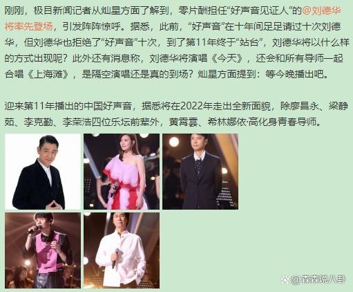 据悉,第十一季《中国好声音》邀请廖昌永、梁静茹、李克勤、李荣浩四位担任导师,黄霄雲、希林娜依·高化身青春导师,那英、庾澄庆、周杰伦等人未能回归。