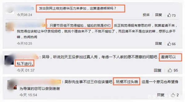 持反对观点的网友认为,吴彤有炒作的嫌疑,他是这档综艺节目的导演,节目中的很多环节都是早已安排好的。为什么偏偏请刘德华而不是其他人呢?作为导演,他难道不知道刘德华很少参加综艺节目吗?