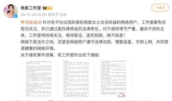 12月20日,杨紫工作室发文称:“针对各平台出现的侵犯杨紫女士合法权益的网络用户,工作室都有在密切关注,并已通过委托律师追究法律责任。”
