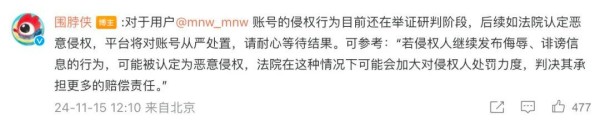随后,其又在评论区回复称:对于用户@mnw_mnw 账号的侵权行为目前还在举证研判阶段,后续如法院认定恶意侵权,平台将对账号从严处置,请耐心等待结果。可参考:“若侵权人继续发布侮辱、诽谤信息的行为,可能被认定为恶意侵权,法院在这种情况下可能会加大对侵权人处罚力度,判决其承担更多的赔偿责任。”