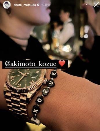 松田翔太晒左手腕特写,戴着刻有老婆名字的首炼,公开Tag对方加上爱心符号,粉碎婚变谣言。(图/翻摄自IG/松田翔太)