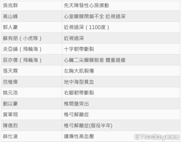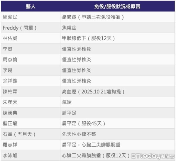 根据《Ettoday》报道,近日网友整理出一份高达35位免役男星的名单,其中包括周杰伦、李威、余祥铨等知名艺人,因各种不同健康因素而获得免役资格,当中免疫最多的原因是僵直性脊椎炎和心脏二尖瓣膜脱垂,另外也有因忧郁症、气喘等情况获得免役资格。